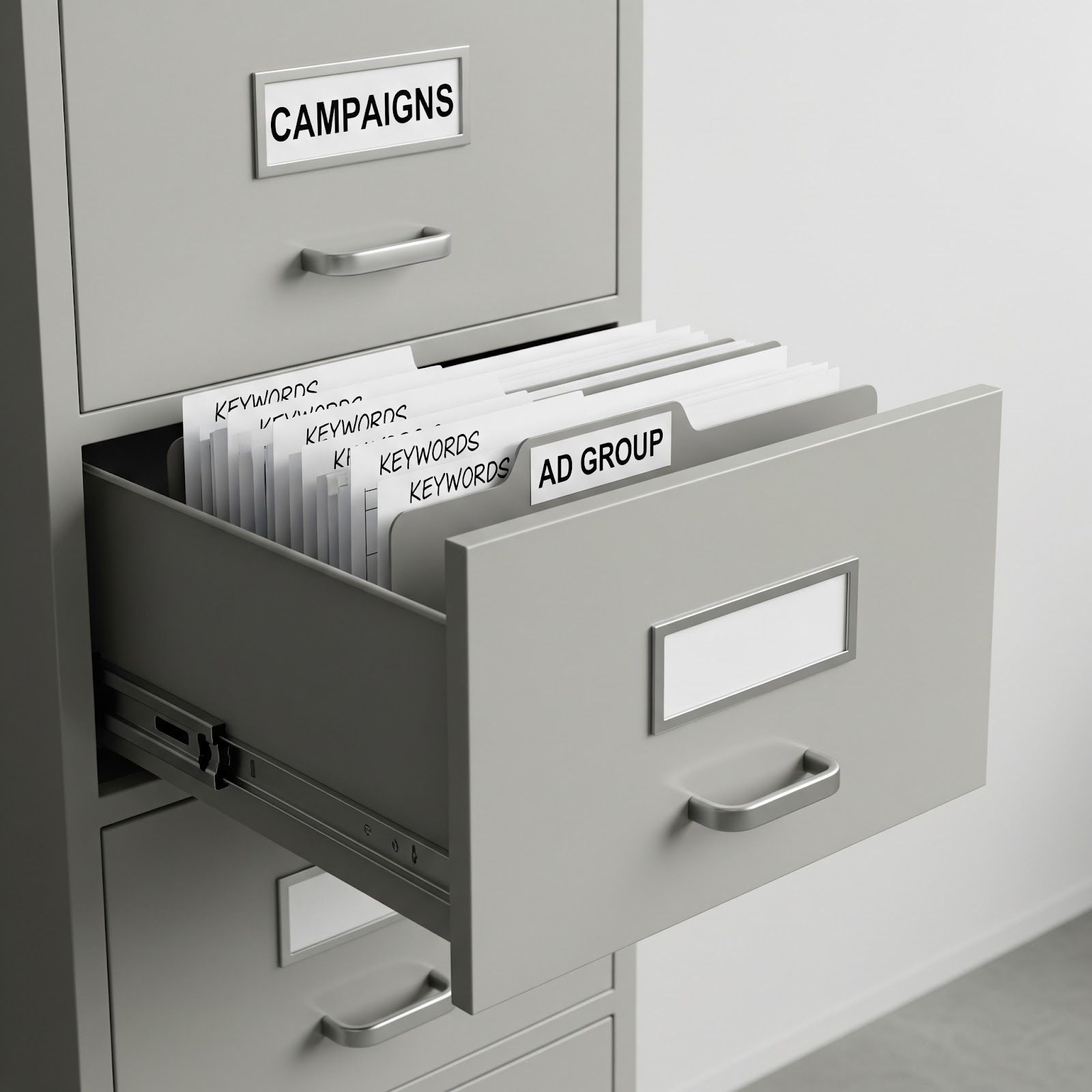 A filing cabinet illustrating the structure of a well-organized ad account with campaigns as large drawers, ad groups as folders, and keywords as papers within the folder.